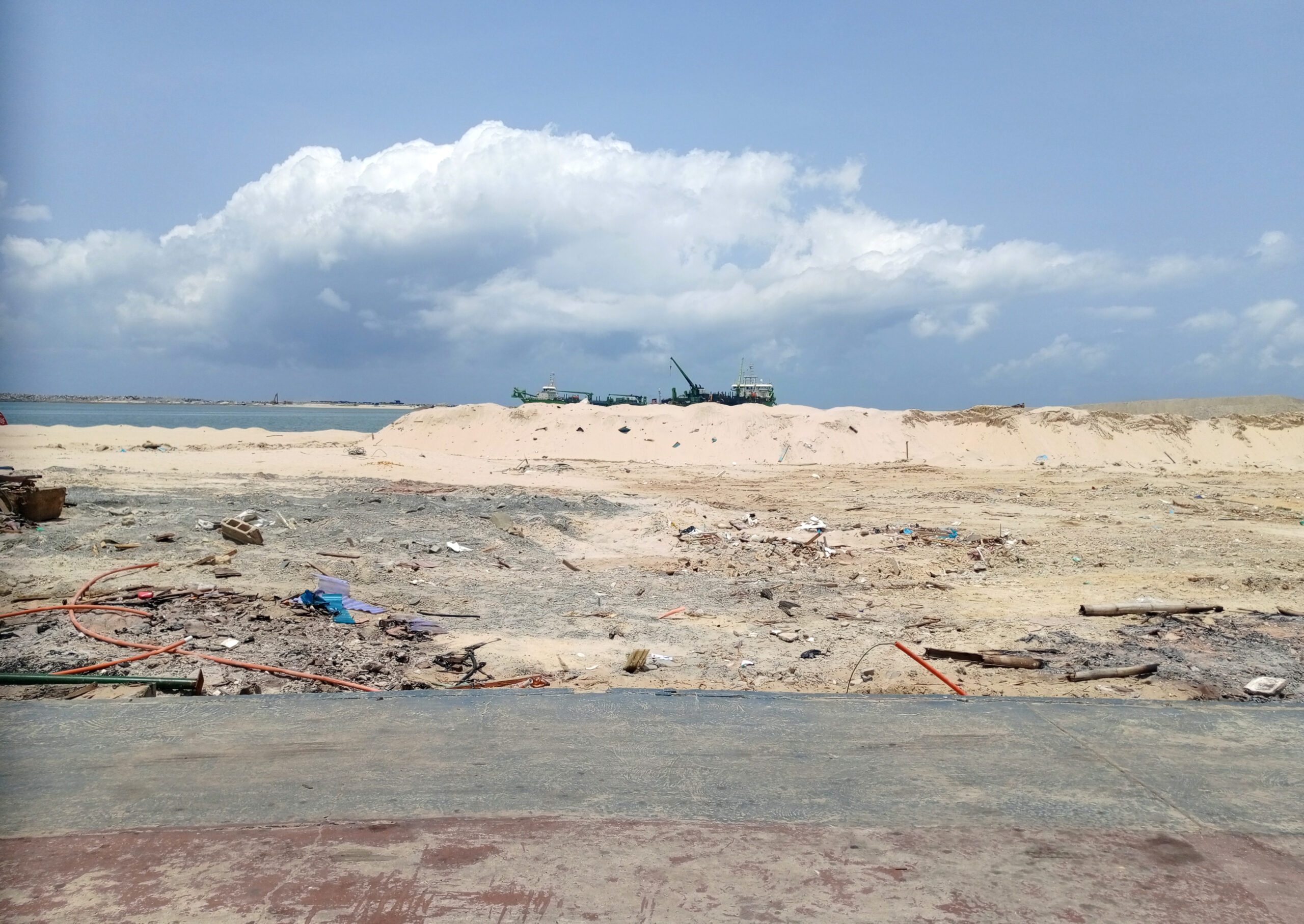 As dredgers pour sand into the lagoon to create new land, entire ways of life are threatened with erasure. The sound piece captures this unfolding transformation through a sonic dialogue between the organic and the mechanical, the rhythmic life of the water and the disruptive force of reclamation. Through layered soundscapes, manipulated field recordings, spoken word from excerpt of One Night at Victoria Beach Poem by Gabriel Okara and word play, this piece creates an auditory map that travels back in time and of a city caught between the forces of capitalism and enviromental forces, between engineered land and an ocean that does not forget.